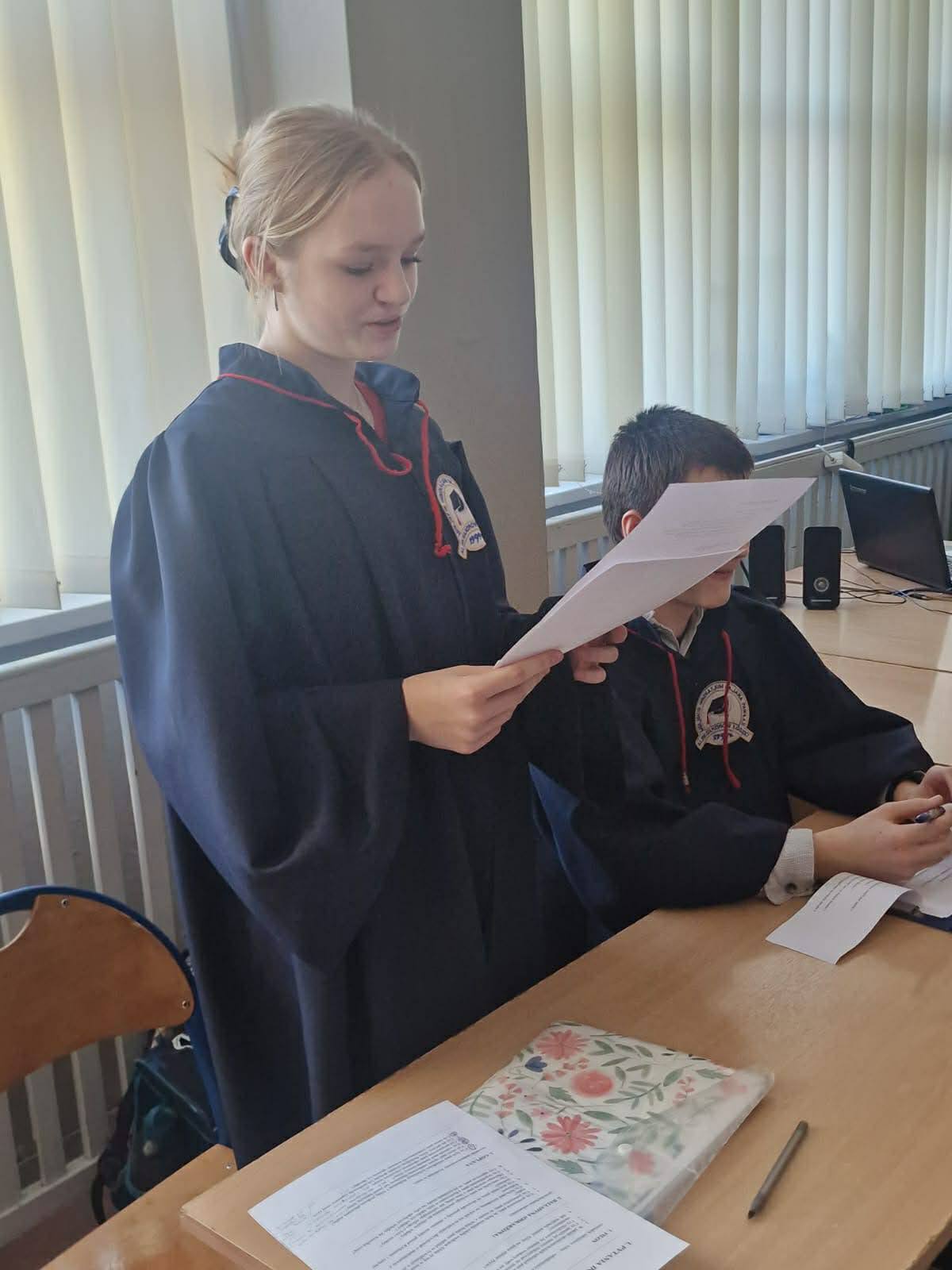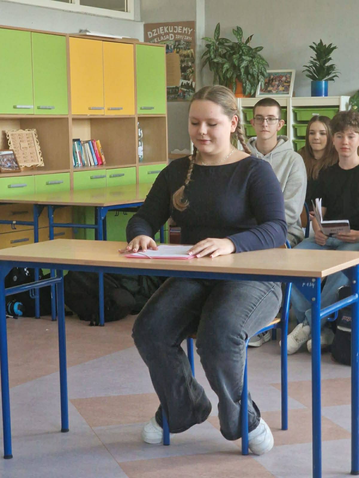 „Balladyna” Juliusza Słowackiego to lektura nietypowa. Mamy w niej bowiem bohaterkę- zdecydowanie czarny charakter. Uczniowie klasy 8b postanowili osądzić Balladynę. W tym celu zorganizowali prawie prawdziwą rozprawę sądową. Był prokurator z aktem oskarżenia, byli obrońcy oskarżonej Balladyny, powołani świadkowie zbrodni kobiety i wreszcie sędzia, który wydał wyrok. Była to wspaniała lekcja argumentacji, dowodzenia, przedstawienia faktów. Wszystko oparte o treść lektury. Uczniom przypadła do gustu taka forma podsumowania pracy z lekturą.