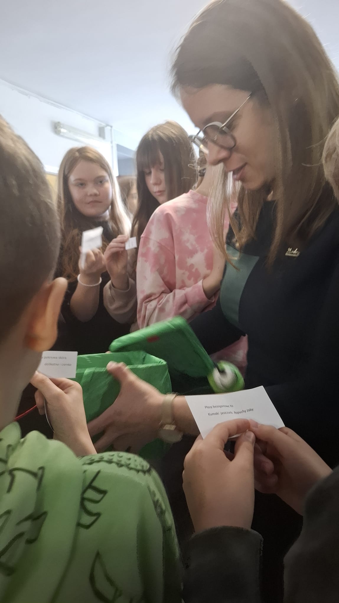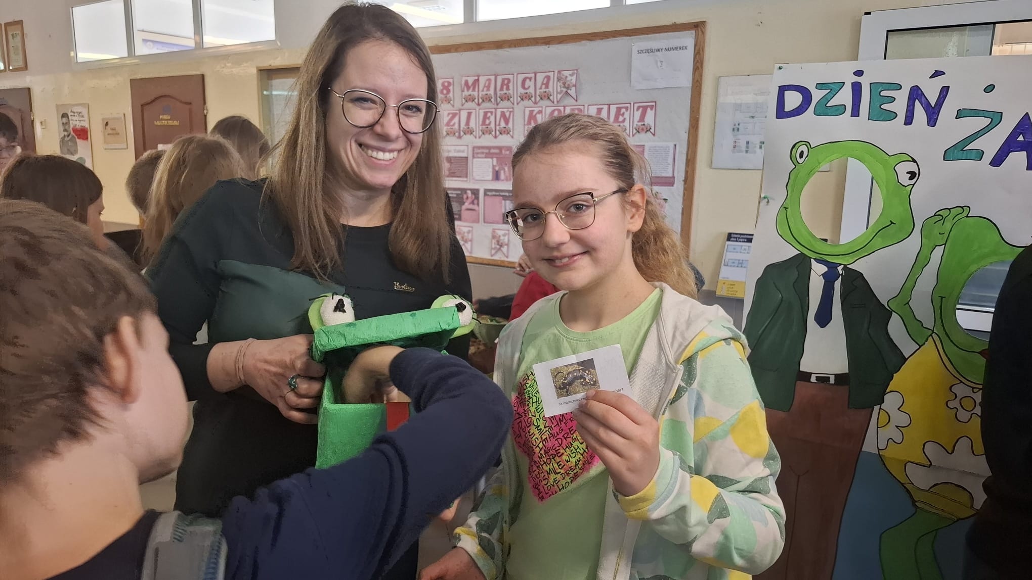 Nie zabrakło też wyzwań dla głowy. Zagadki o żabach i innych płazach potrafiły zaskoczyć – czasem trzeba było wytężyć wzrok, by rozpoznać, co kryje się na ilustracji. Opłacało się: poprawna odpowiedź oznaczała plus z biologii lub przyrody, a jak wiadomo – plusy bardzo cieszą naszych uczniów.