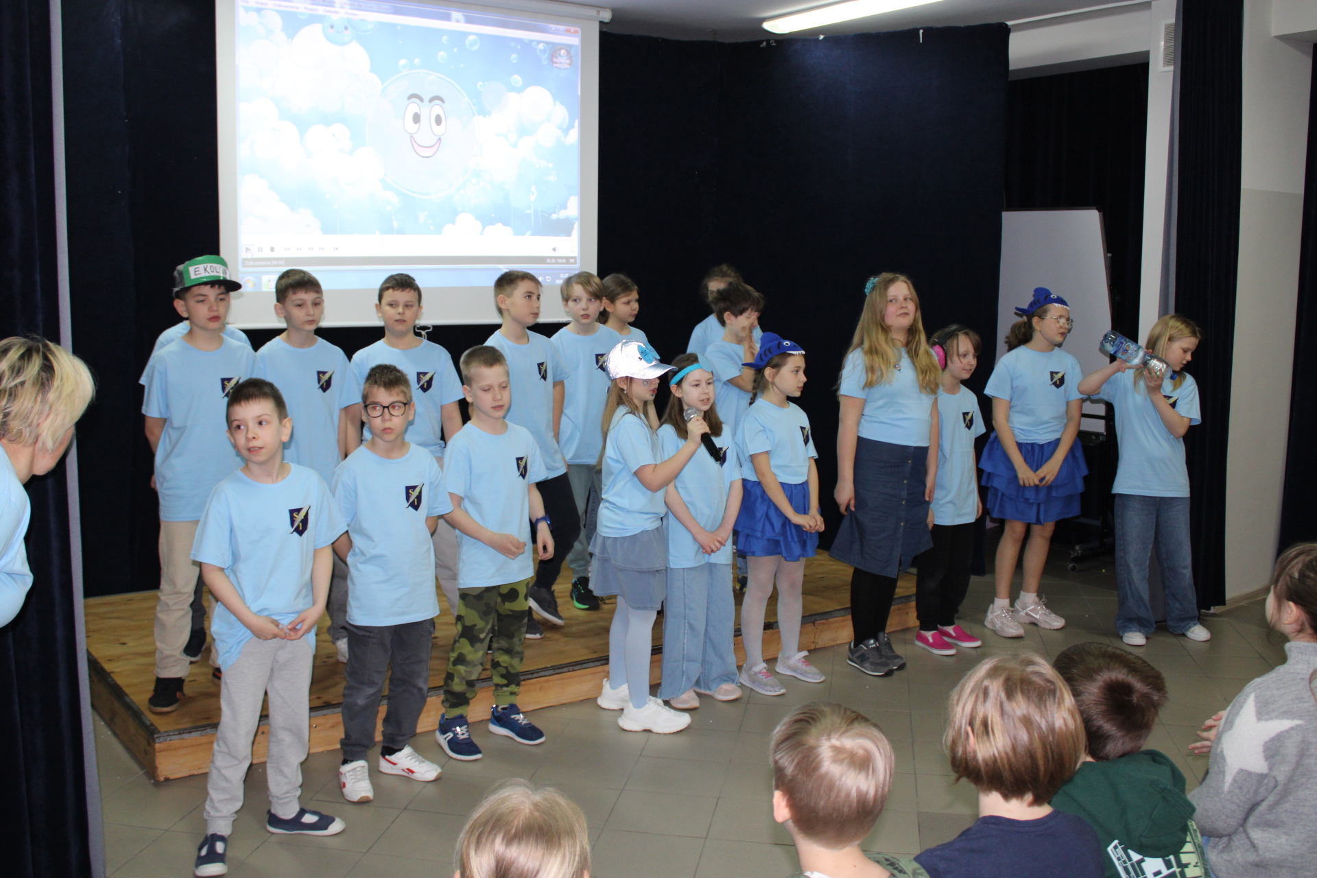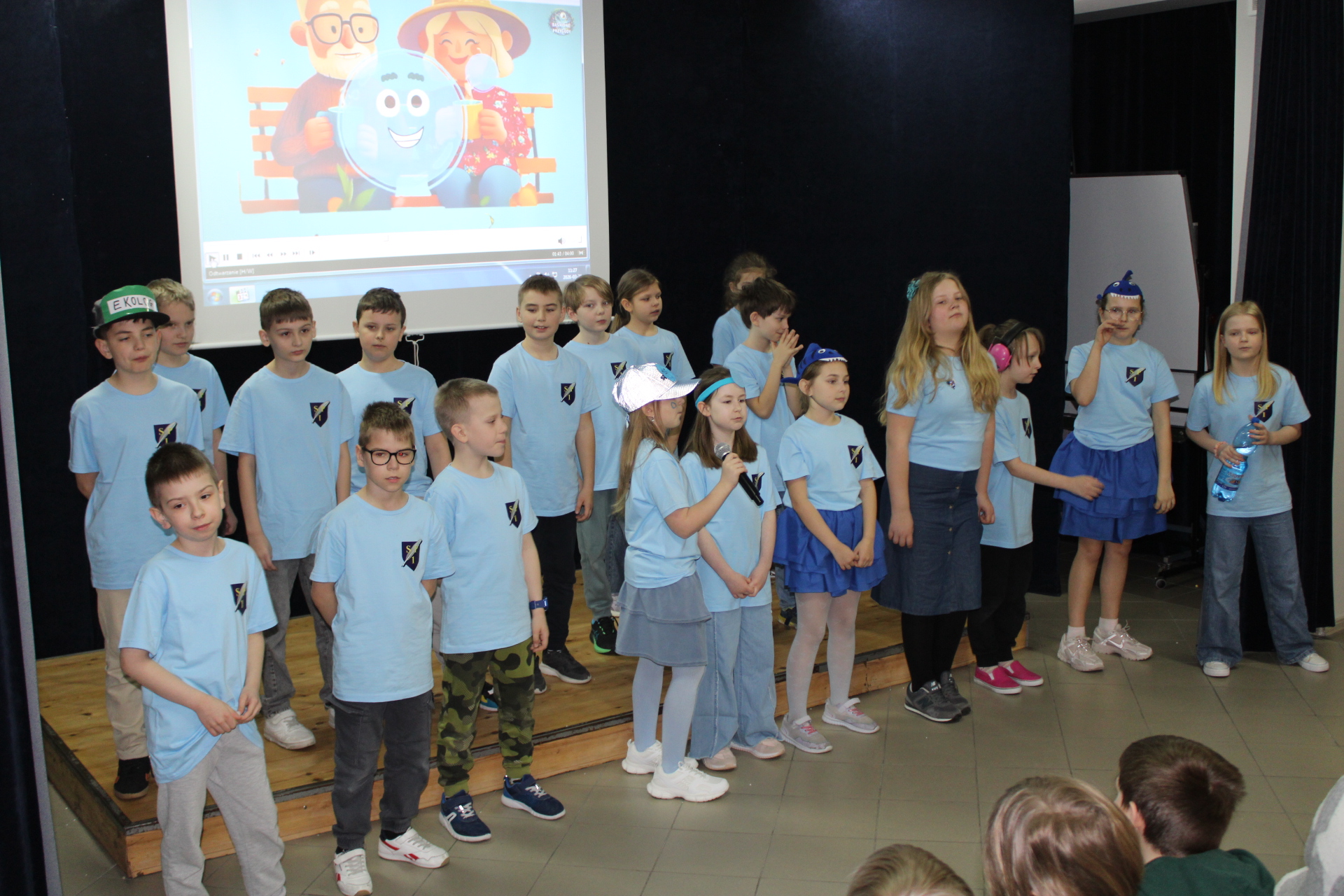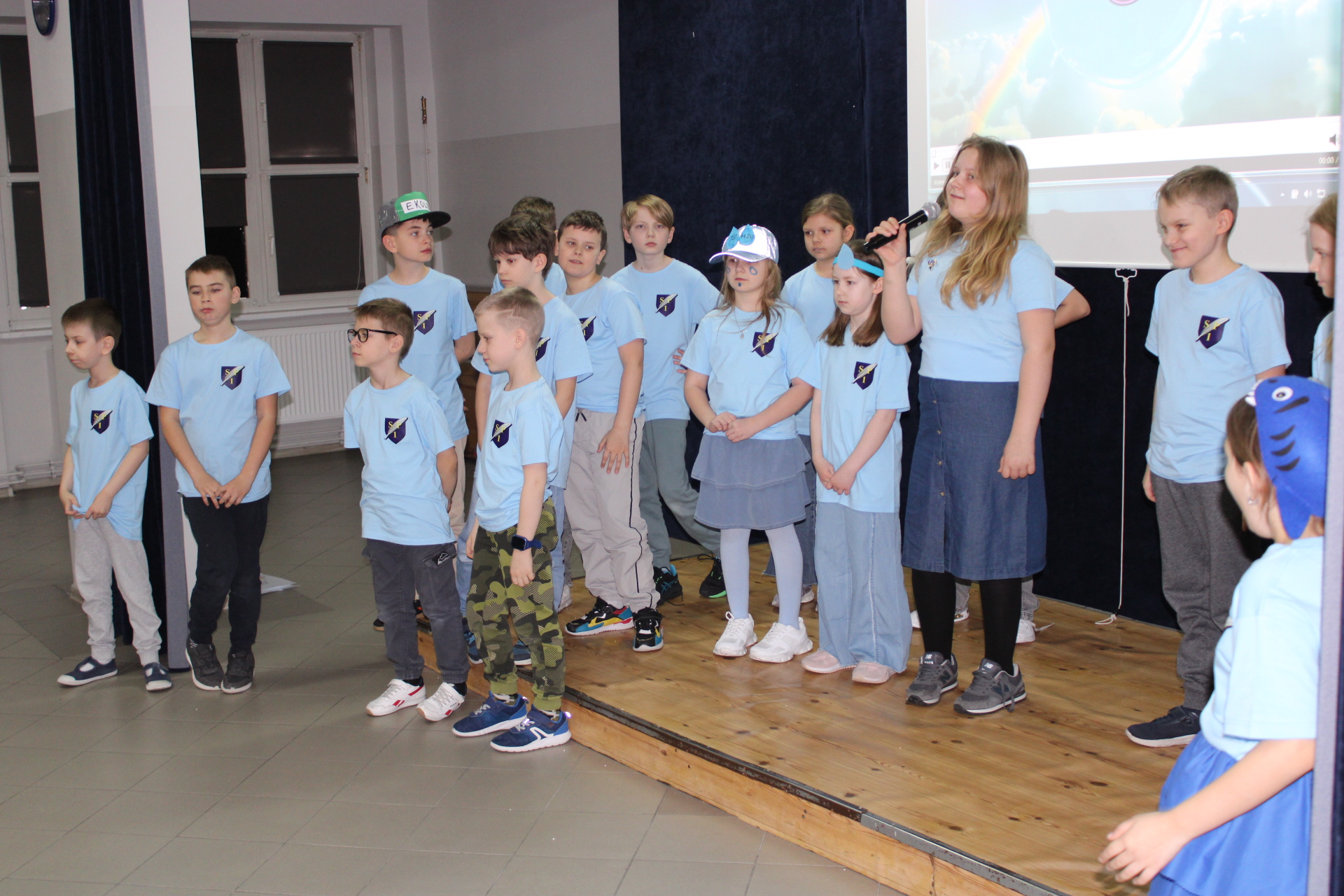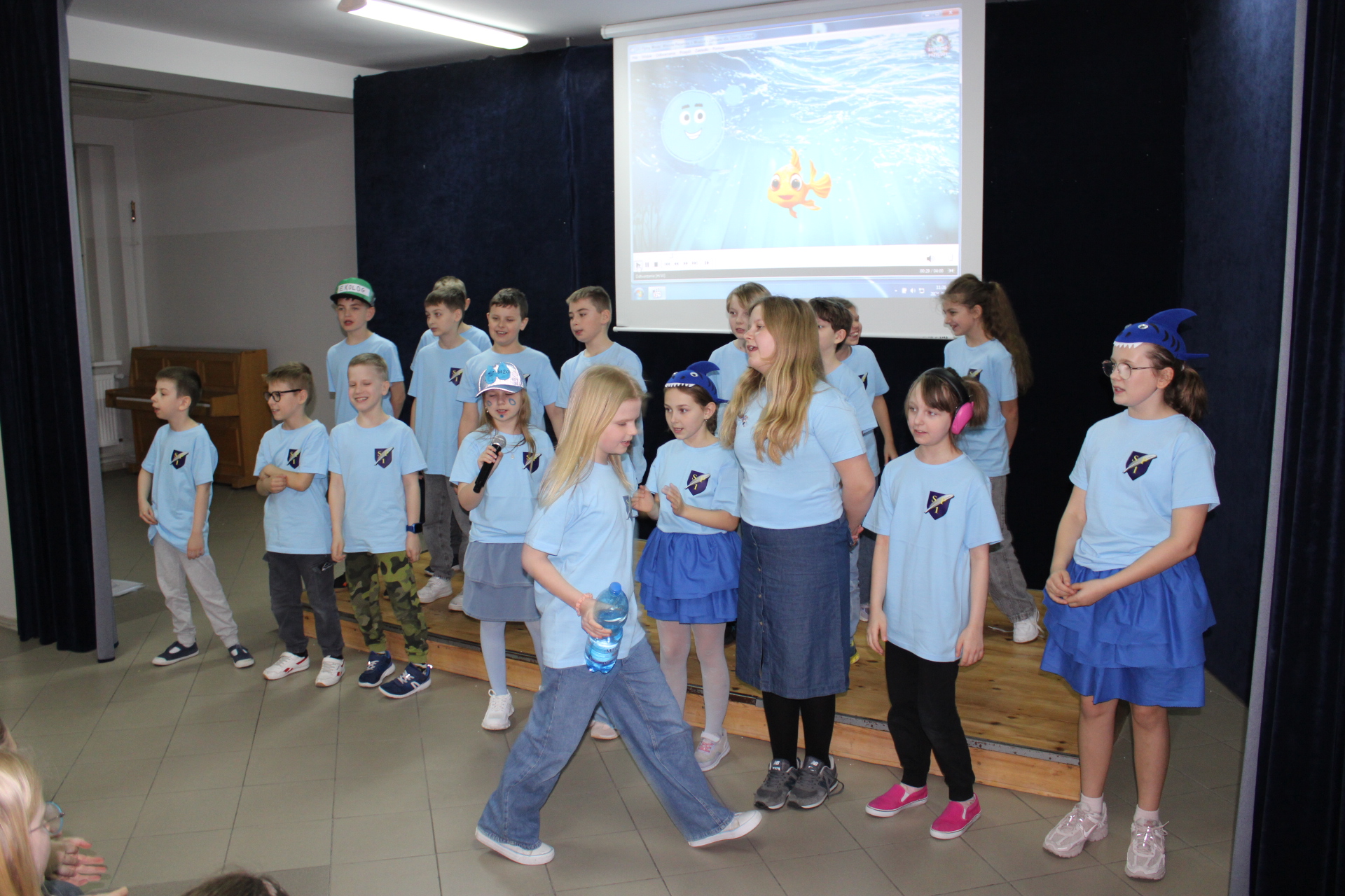 31 marca 2026 r. uczniowie klas młodszych obejrzeli przedstawienie pt "WODA" w wykonaniu dzieci z klasy III a. Wykonawcy przypomnieli, jakie znaczenie ma woda w naszym życiu. Poprzez swój występ dostarczyli widzom wielu niezapomnianych wrażeń. Wszyscy włączyli się do śpiewania piosenki pt." Pijmy wodę". W trakcie przedstawienia panowała cisza i duże zainteresowanie wśród widzów. Stroje wykonawców w pełni pasowały do treści przedstawienia. Trzecioklasisci zaprezentowali się w niebieskich podkoszulkach. Dziękujemy wszystkim za ogromne brawa i ciepłe słowa. Pijmy wodę, zgodnie ze słowami naszej piosenki.