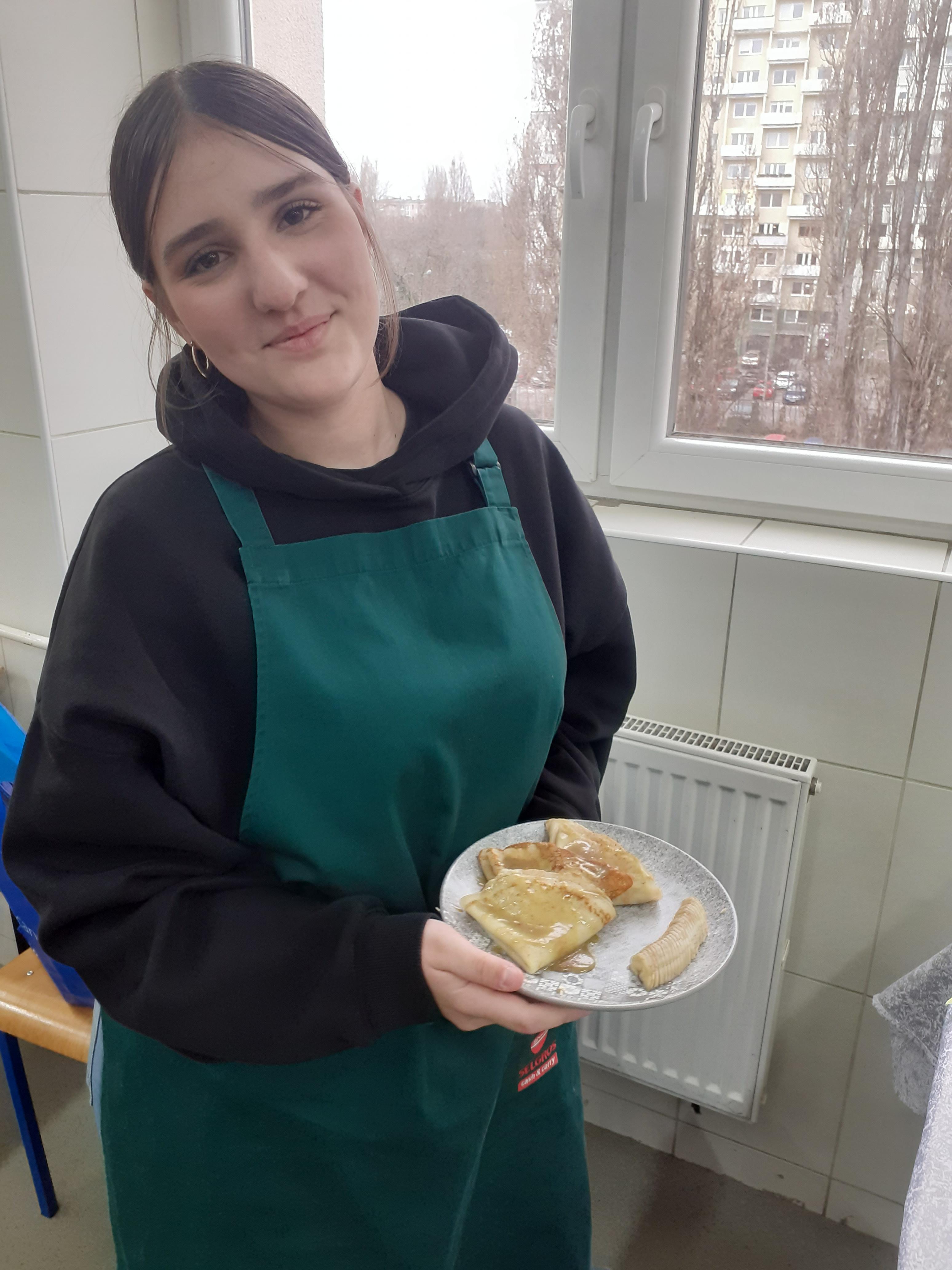 W piątek 27 marca uczennica naszej szkoły Kornelia Górska z klasy 8b wzięła udział w finale II Wojewódzkiego Konkursu Gastronomicznego w Języku Angielskim pt. "Breakfast Creations", który odbył się w Zespole Szkół Gastronomicznych w Łodzi. Droga do finału nie była łatwa i zakwalifikowało się do niego jedynie 7 uczestników. W pierwszym etapie uczniowie musieli nakręcić kilkuminutowy film w języku angielskim podczas którego przygotowywali potrawę śniadaniową z wykorzystaniem świeżego owocu. Kornelia przygotowała francuskie naleśniki z nadzieniem pistacjowo-bananowym. To samo danie finaliści musieli odtworzyć w 60 minut przed liczną komisją odpowiadając w międzyczasie na pytania, a następnie prezentując danie w języku angielskim. Poza znajomością języka angielskiego ocenie podlegała: poprawność wykonania, kreatywność, stopień trudności, smak i wygląd dania oraz porządek i czystość pracy. Wszystkie potrawy wyglądały apetycznie i smakowały wybornie.